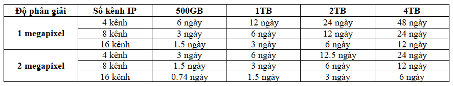 Nếu bạn cảm thấy khó tính toán theo công thức trên thì có thể tham khảo bảng sau đây để biết được thời lượng lưu trữ của một số hệ thống camera phổ biến.